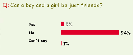 |  Views on Poll   Name: sailaja Country: India Comment: yes can be whts wrong Name: Srini Country: India Comment: No i cant say any thing regarding this because, it related to both of them once they desided to be a friend in childwood but in future they may watch may thing what happening in the word so according to that situation they may change. so in my point of view its depend up they feel in the heart. Name: Srini Country: India Comment: No i cant say any thing regarding this because, it related to both of them once they desided to be a friend in childwood but in future they may watch may thing what happening in the word so according to that situation they may change. so in my point of view its depend up they feel in the heart. Name: Charu N. Saluja Country: India Comment: Yes a girl and a boy can be only friends. Its need not necessary that their is love in every relation, here love is (Mohabbat). You can love only one person but not all your friends. Love is sharing each n every thing, each n every momennt, which can not be shared with every 1. So, its not necessary that there is love in friendship. Their is affection but not love. I am an live example of this. A friend is a friend and lover is lover. One should learn to differentiate between love and friendship. Name: Dreamy girl Country: India Comment: No, a boy and a girl can't be just friends. A girl who says that particular boy is her best friend will surely get jealous when that boy will be close with other girl. Why such jealousy then? God has created a MALE and a FEMALE so that some day they will fall in LOVE. so a boy and a girl can NEVER BE JUST FRIENDS. Name: Umashankarsingh Rathod Country: India Comment: I can't admit that boy and girl are said to be as a friend for long time..From God.gift of heart structure is so constructed that after some time such sense auotomaticaly creates that that breaks all the limitation of the friend relation. Before going to discuss about the friend relationship one should must draw the limit of the friend then can decide the exact friend relationship. OK. Umashankarsingh rathod Nagpur Name: Umashankarsingh Rathod Country: India Comment: I can't admit that boy and girl are said to be as a friend for long time..From God.gift of heart structure is so constructed that after some time such sense auotomaticaly creates that that breaks all the limitation of the friend relation. Before going to discuss about the friend relationship one should must draw the limit of the friend then can decide the exact friend relationship. OK. Umashankarsingh rathod Nagpur Name: Vasundhara Country: India Comment: Ofcourse Yes.. The only point of concern is the level of commitments shared to be a part of the purest realtion on earth and make it a success. Yes, a Boy and a Girl can defintley be just best friends. Name: soniya Country: India Comment: no it's impossible.or rarely possible.because one of them may take different meaning of friendship... Name: Vandana Country: India Comment: No, they can't....cauz opposites always attract!!!! Name: Vandana Country: India Comment: No, they can't....cauz opposites always attract!!!! Name: Stephaine Country: U.S.A. Comment: Ok i have had my best friend and he is a boy for 10 years and we have never done anything together so yea boy's and girl's can be just friends Name: Anuja Country: U.A.E. Comment: It is really hard to say if a girl and a boy can be just friends or not. I have seen a boy and a girl who are really good friends and who got married to two different people and a boy and a girl who were initially friends and then started dating each other. The situation can be different and can change according to the circumstances. For example, when I was in junior college, a boy who was my best friend once told me that he had feelings for me. Since that day I started avoiding him as I had never seen him in any other way than just a friend. Soon we lost contact with each other. I am not sure if people of opposite genders can be just friends or not. Name: Sandip Country: Indonesia Comment: No, a girl and a boy can not be only friends or best friends. Recently I saw the movie Jane Tu Ya Jane Na and I realized that all movies try to show that a girl and a boy cannot be only friends. Yes, a boy or a girl can have a group of friends in which there are both male friends and female friends, but when one girl and one boy are friends, sooner or later they start liking each other and then they get infatuated by each other and finally they fall in love with each other. I may be sounding quite rigid while giving my opinion but there must be many love stories out there that must have started with friendship. Friendship between a girl and a boy finally ends in love. Name: Pooja Country: India Comment: Yes, why not? A boy and a girl can be friends without developing any intimate or romantic relation between them. My best fried is guy and we know each other for five years now. We share everything with each other. We discuss our problems with each other and come up with solutions for each others problems. My best buddy never felt anything else for me. Our relation is of pure friendship and nothing else. Sometimes our other friends tease us that one day we will fall in love and all but I believe that we have great respect for each other and can not think of having any other relation with each other. HOME | Comments or Suggestions | Resources | RSS Site Map | Contact Us | Advertise with Us All Rights Reserved Worldwide. (c) 1999 - 2009 India Parenting Pvt. Ltd. Please be sure to read our Copyright, Disclaimer and Privacy Policy |