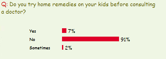 |  Views on Poll   Name: priya dutt Country: India Comment: not in case of kids, even for elders too, i try some home remedies... now adays so much of info. is already available on internet... Name: Rashmi Country: India Comment: It is opposite in my case. Sometimes doctor’s medicines do not completely cure the illness so to uproot the illness completely I try home remedies. My child had got cough. Doctor gave antibiotics. It helped in curing throat infection and cough to certain extent. But he still had cough. I tried giving juice of tulsi leaves to my child. It helped a lot to cure his cough. Name: Renuka Country: India Comment: There is no need to consult a doctor for small problems but if the symptoms do not subside after using home remedies, we need to consult a doctor. Name: Kalindi Country: India Comment: Home remedies for common problems like cough and cold are ok. But I immediately consult a doctor if my child gets fever.   INDIAPARENTING IN THE NEWS HOME | Comments or Suggestions | Resources | RSS Site Map | Contact Us | Advertise with Us All Rights Reserved Worldwide. (c) 1999 - 2015 India Parenting Pvt. Ltd. Please be sure to read our Copyright, Disclaimer and Privacy Policy |