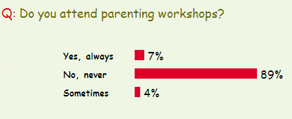|  Views on Poll   Name: Yashwi Country: India Comment: There is no need to attend parenting workshops because there is a lot of stuff on parenting available online which can help us to improve our parenting skills. These online tips and advices are the best and we can discover a lot of things related to parenting by researching online. Name: Sunanda Country: India Comment: Yes I attend workshops on parenting regularly because sometimes we make many parenting mistakes unknowingly. We need right guidance on parenting for proper upbringing of children. So I do attend workshops on parenting conducted by experts so that I can improve my parenting skils. Name: Kalyani Country: India Comment: If it free, I definitely attend. However, these days lot of people charge money for such workshops. If someone is offering free parenting workshops, I will definitely join.   INDIAPARENTING IN THE NEWS HOME | Comments or Suggestions | Resources | RSS Site Map | Contact Us | Advertise with Us All Rights Reserved Worldwide. (c) 1999 - 2015 India Parenting Pvt. Ltd. Please be sure to read our Copyright, Disclaimer and Privacy Policy |