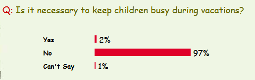 |  Views on Poll   Name: Himanshu Country: India Comment: It is very important to keep children busy during vacations. In fact parents should also get involved with children in some activity or the other. Name: Pranaya Country: India Comment: Children should not be forced to do something rather they should be set free at least during the times of vacations. Guiding them to take-up some activity or the other is good and they must willingly take-up this activity. Name: Seema Country: India Comment: It is necessary to keep children busy during vacations so that the valuable time which they can use to learn something is not wasted.   INDIAPARENTING IN THE NEWS HOME | Comments or Suggestions | Resources | RSS Site Map | Contact Us | Advertise with Us All Rights Reserved Worldwide. (c) 1999 - 2019 India Parenting Pvt. Ltd. Please be sure to read our Copyright, Disclaimer and Privacy Policy |