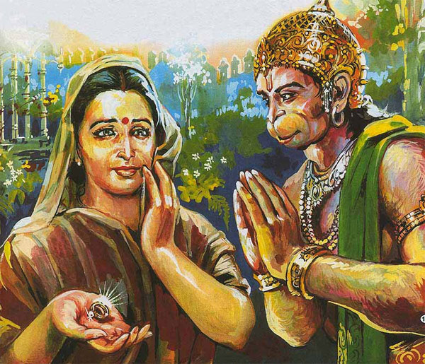 Finally, Hanuman happened upon Sita in the Ashoka grove. There she sat, a forlorn figure, surrounded by demonesses. Hanuman managed to creep up to her unnoticed. He told Sita that he was a messenger from Ram and gave her the signet ring that Ram had entrusted to him. He told her how her husband pined for her and reassured her that Ram would bring reinforcements and rescue her from captivity. Sita was overjoyed to see a friendly face after such a long time. She pulled a jewelled ornament from her hair and told Hanuman to give it to Ram so that he would know that she was alive and well.